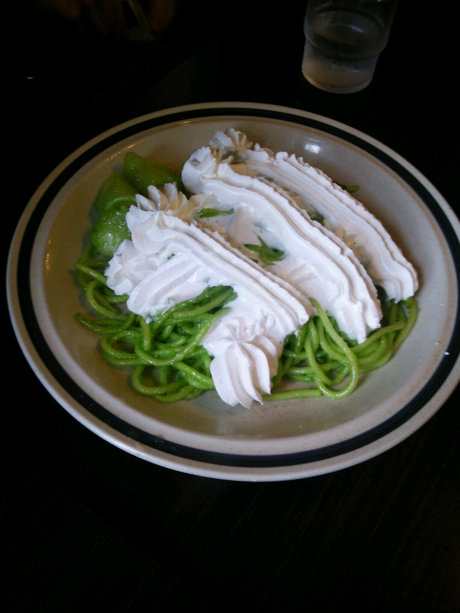 麺は緑、生クリーム、湯気出てる、時間がたつと熱さで生クリームが溶ける、もうわけがわからないよ!こんなのぜったいおかしいよ!