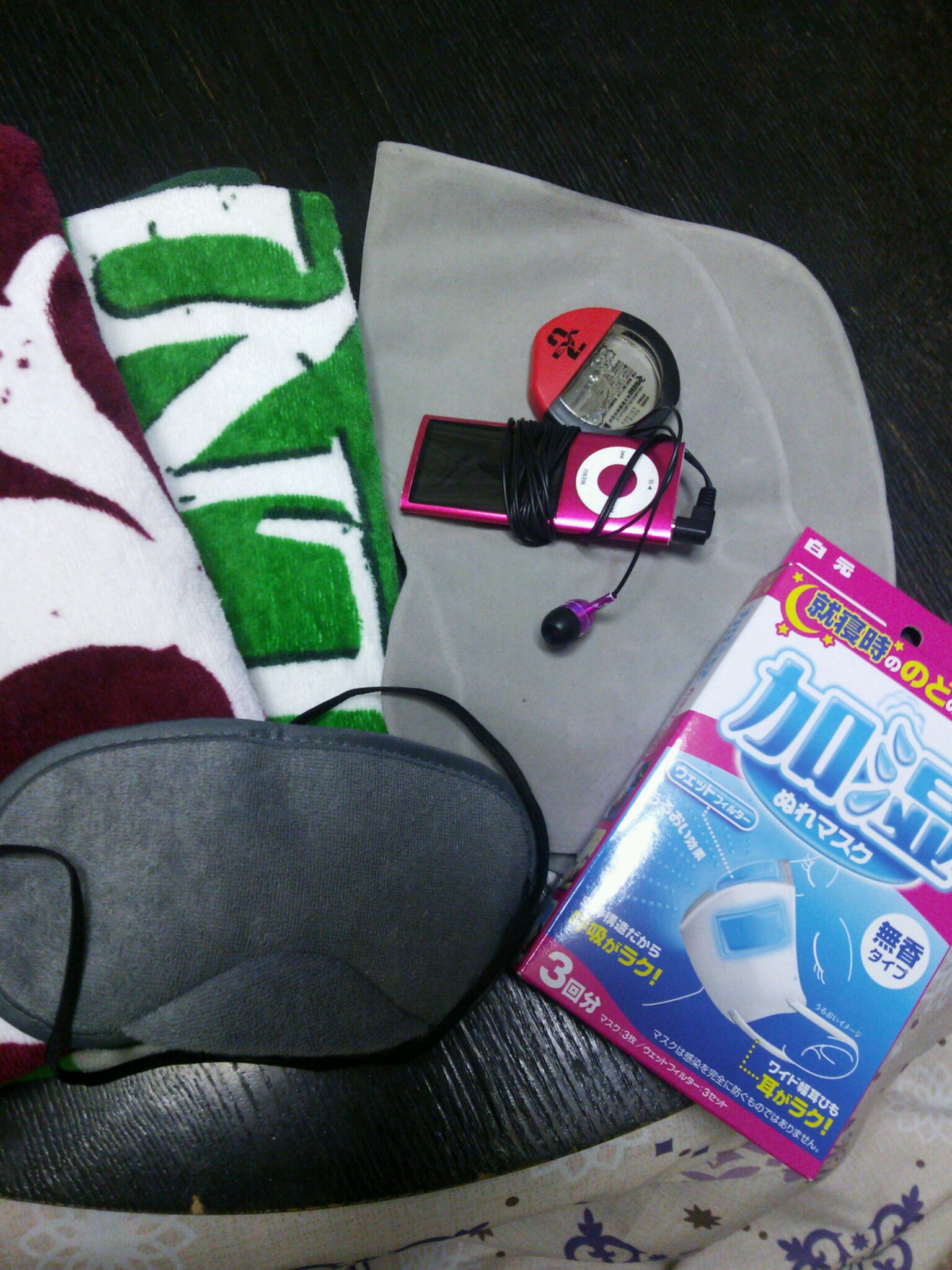 アイマスク…車内は消灯しても小さい電気がついている。目をつぶっても案外気になるので、アイマスクでシャットアウトします。